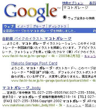 『マコトガレージ』 勝手にライバル意識をしてしまい、ロボット検索にも引っ掛かりやすいようにTOPページをいじくりました。 その結果、上に来ましたよ。やったね。03.02.06現在 しかーし、肝心な事として、、、『マコトガレージ』で検索する人なんていないよ。 【更新】 と言うよりは変更ですね。 bbs を変えました。 ○デランスがうっとおしかったんだよ。 書き込み、よろしくです。 |