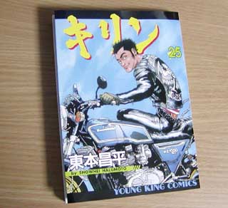 初めて読んだ時はあまりに衝撃的で思わず『刀』を買おうかと思ってしまった漫画『キリン』 気が付けば25巻が出ていたので購入。最近買う漫画ってこれと『SS』だけだなあ。 で、25巻で分かった事、「キリンってマサキじゃなかったのね」 ところで、漫画でMr.バイクかBGに掲載されてたと思うんだけど、モヒさんが出てくる漫画で『バクダン』ってのがあったと思うんだけど、あれって単行本になってるのでしょうか? 知ってる方がおられましたら、教えて下さい。 東本昌平さんファンの多田でした。 |